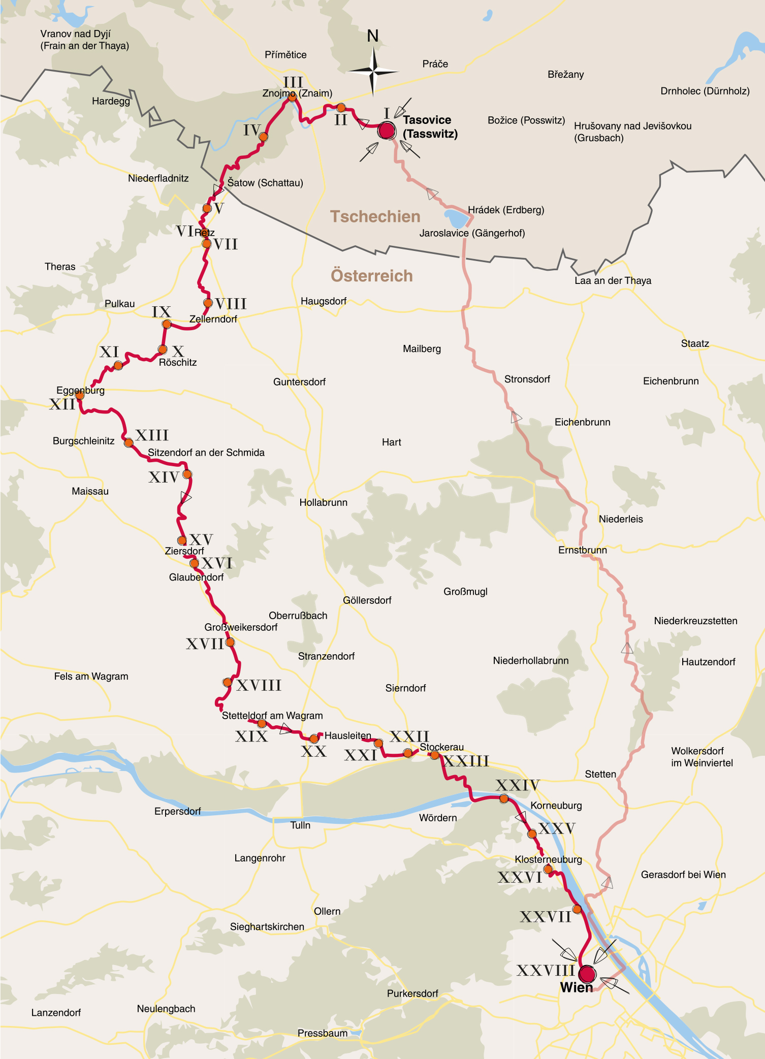 Für den östlichen Wegabschnitt von Wien über Bisamberg und Ernstbrunn zurück nach Tasovice ist keine Beschilderung vorgesehen. Die Tourdaten können Sie sich als *.gpx Datei herunterladen.